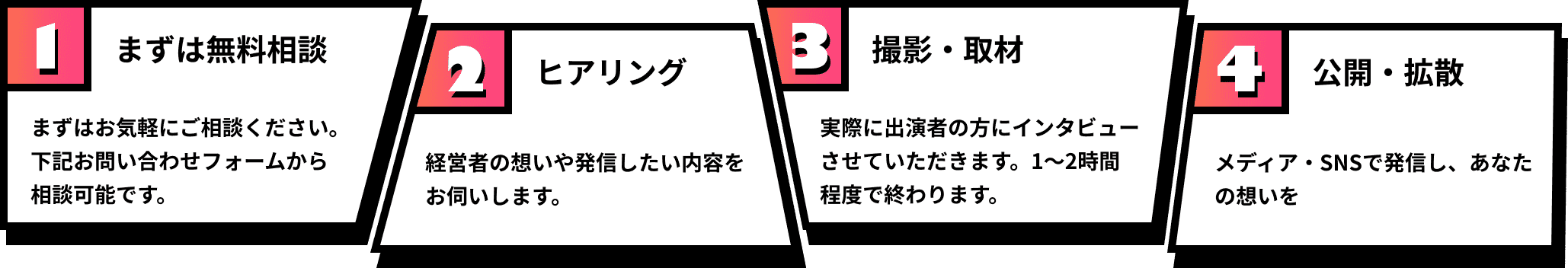 お問い合わせ後にヒアリングを行い、インタビュー撮影・編集を経て公開までサポートします。